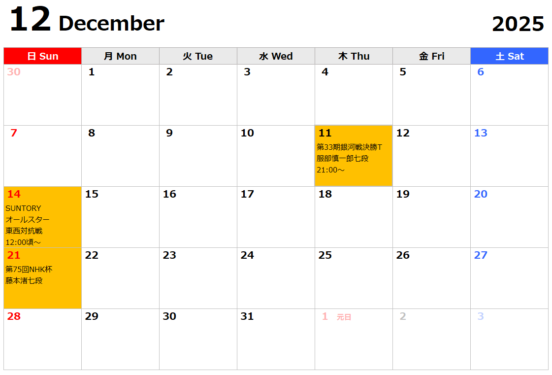 【藤井聡太※今後の対局予定/確定】▼2025年12月度分▼